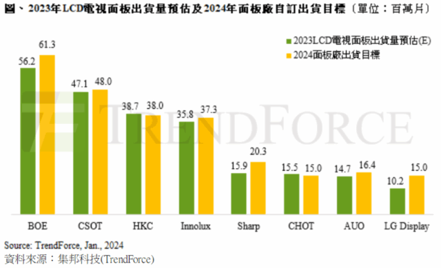 至於夏普(Sharp)除廣州43吋因受惠訂單轉移,國際品牌客戶對其需求也有所增長。日本Gen10堺(Sakai)工廠在去年下旬開始加入32吋單切產品,今年也將加入32吋及65吋混切產品,以改善該廠產品競爭力,因此在出貨目標設定較為積極,約2,030萬片。